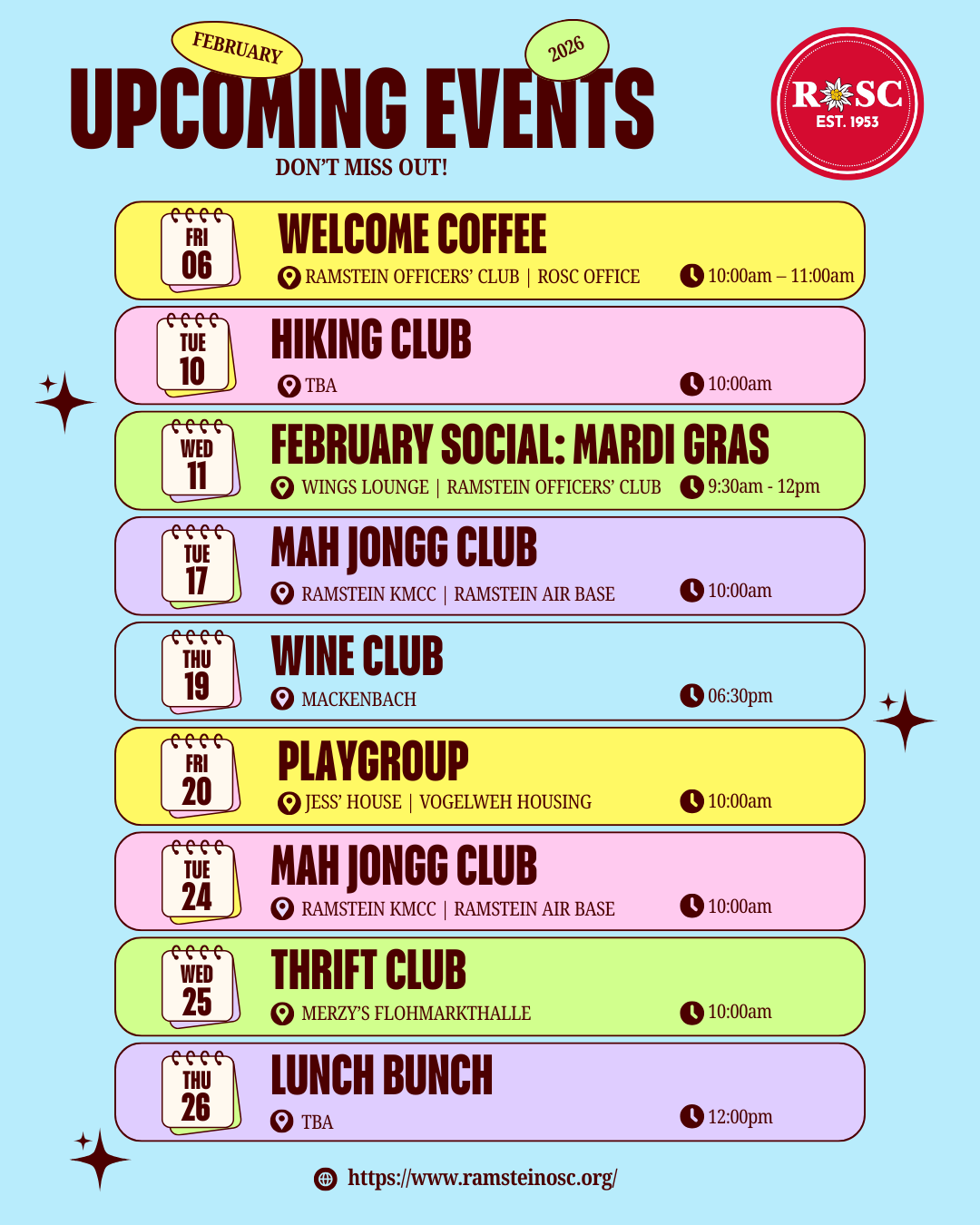 Welcome Coffees are held at the ROSC Office in the Ramstein Officers' Club in February, April, September and November. This is a great time and place to learn more about ROSC for newcomers and members looking to get more involved.