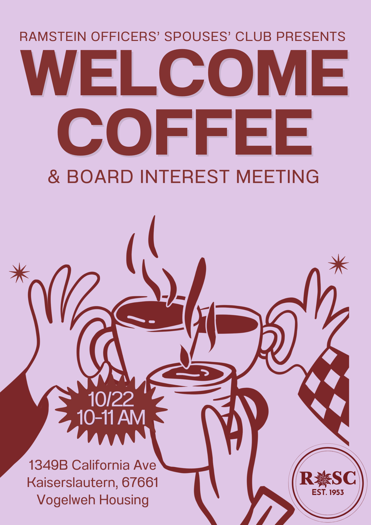 New to ROSC? Would you like to learn more about our Club and our Board Positions? Join us for a Coffee at the Spouse Hub (Lower Level, E-CLUB). We can’t wait to see you there! Questions? president@ramsteinosc.org